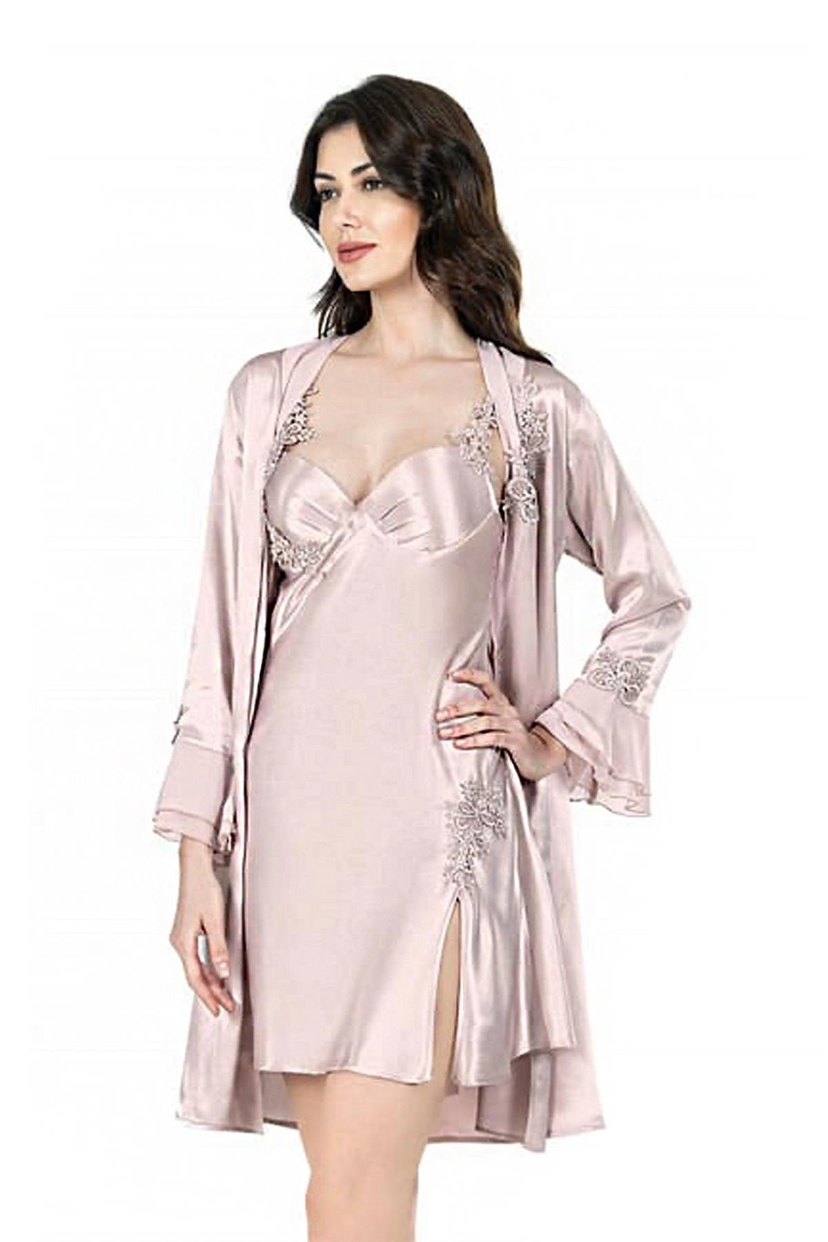 Dantel detaylı kısa gecelik sabahlık takım, yumuşak pudra tonu ve zarif kesimiyle romantik bir şıklık sunar.