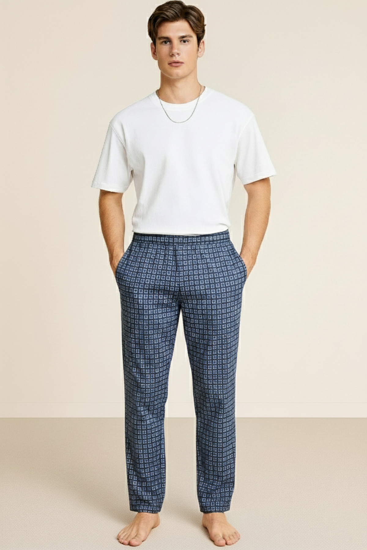 Klasik ekose desenli pijama altı tasarımıyla stil sahibi bir görünüm sunarken, yan cepleri sayesinde günlük kullanım için pratiklik katar.