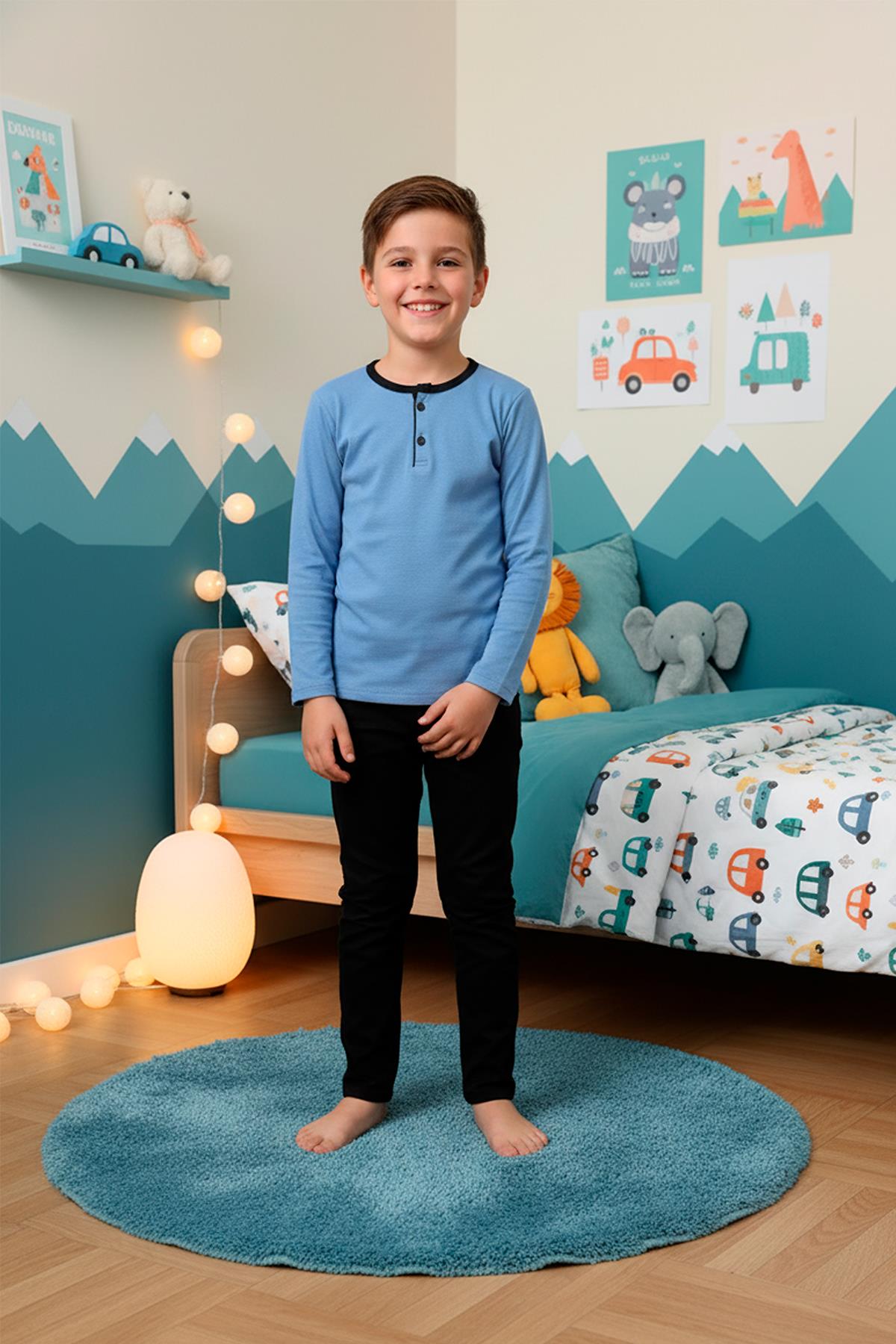 Konforlu yapısı ve sade tasarımıyla öne çıkan erkek çocuk pijama takımı, yumuşak dokusu sayesinde çocukların uyku ve ev içi rahatlığını destekler.