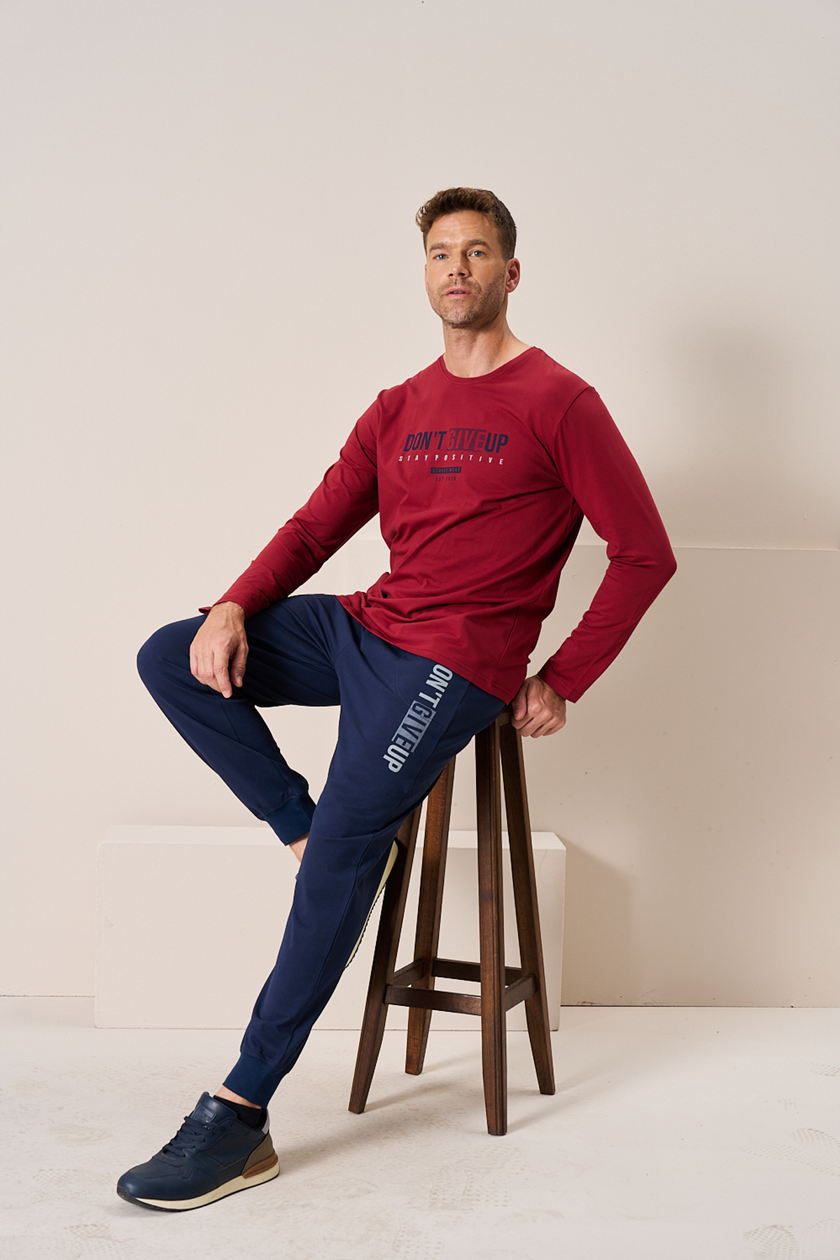 Üzerinde “Don’t Give Up / Stay Positive” baskısı bulunan bordo üst parça, pozitif bir enerji yansıtırken lacivert alt parça ile mükemmel bir renk uyumu sağlar.