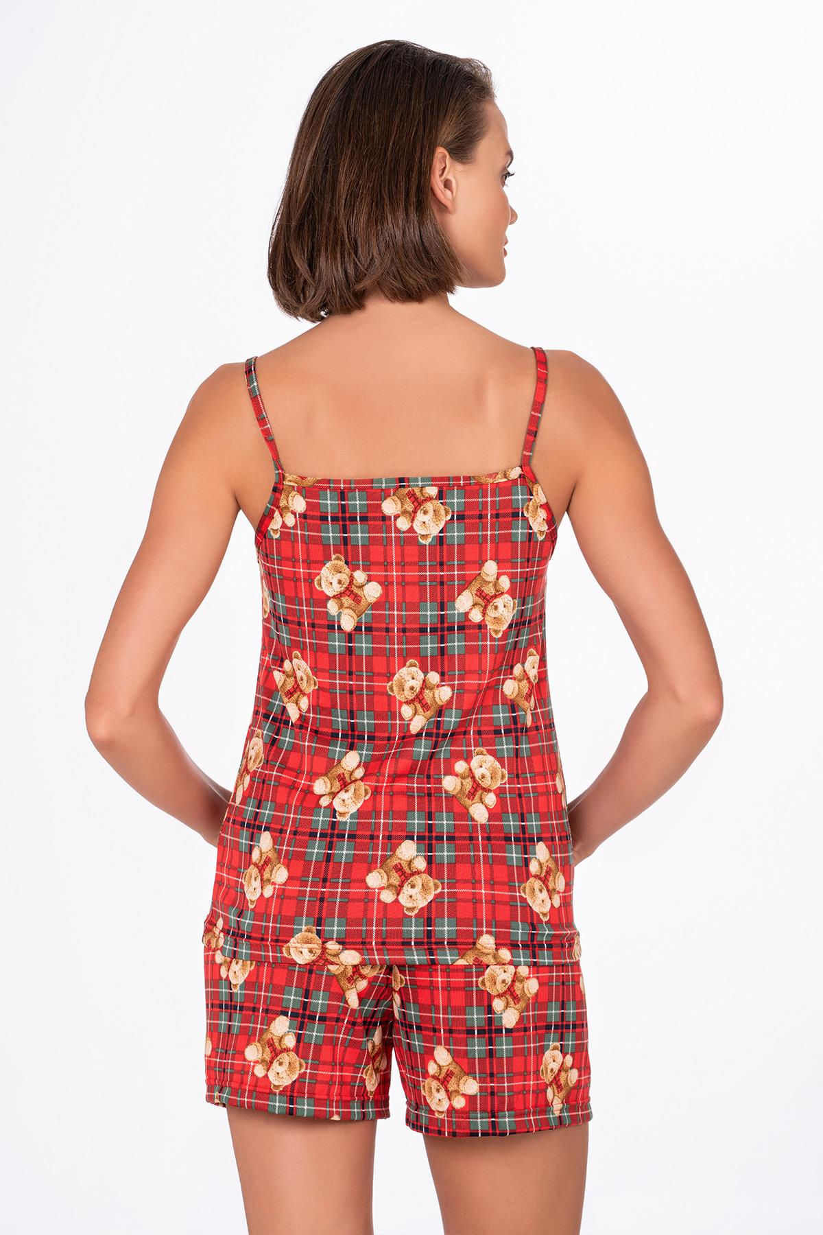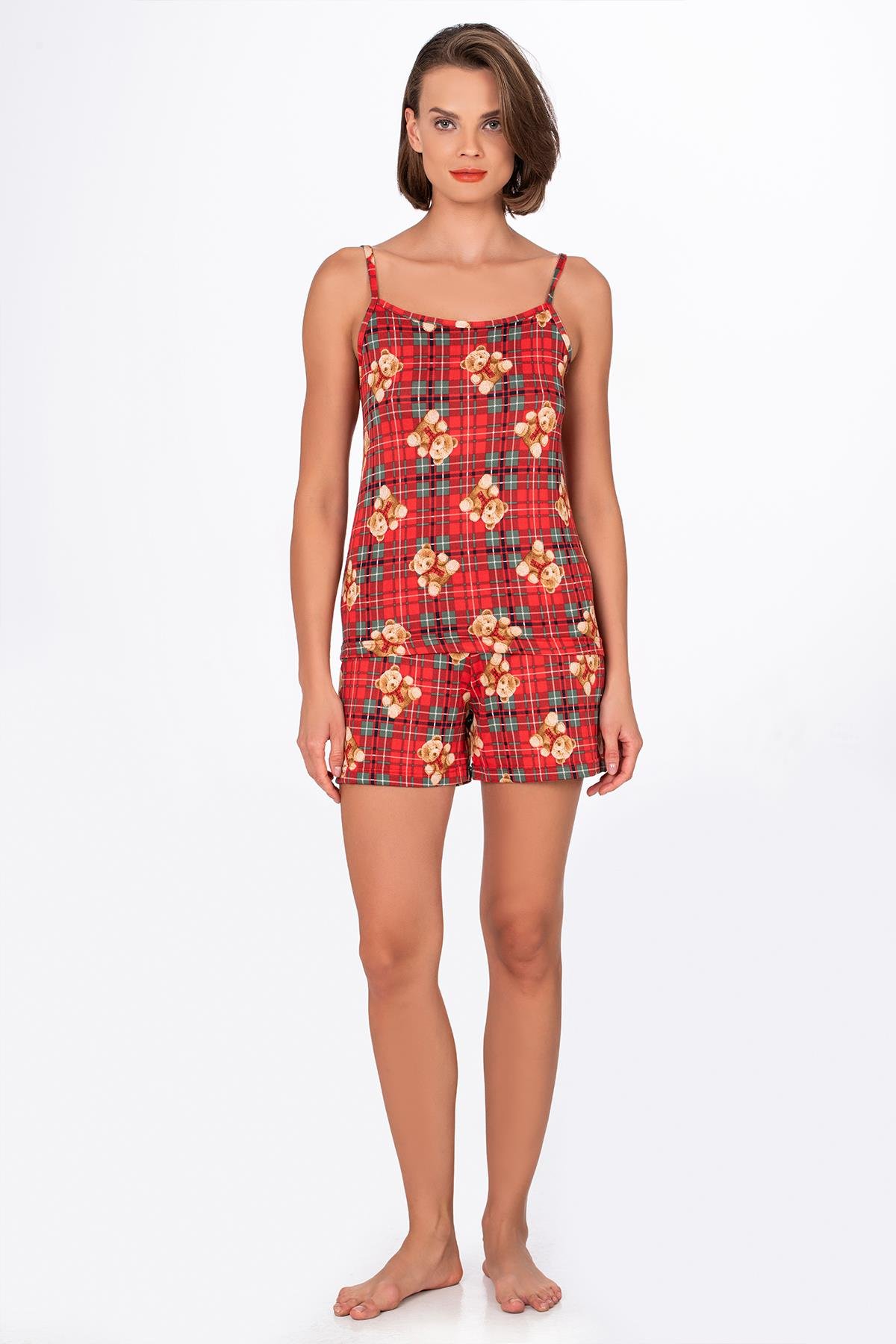 Kadın Ayıcık Desenli İp Askılı Şortlu Pijama Takımı, kırmızı kareli zemin üzerine yerleştirilmiş sevimli ayıcık desenleriyle enerjik bir görünüm sunar.
