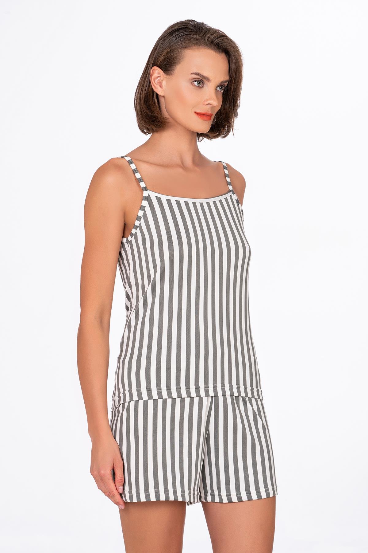 Kadın Çizgili İp Askılı Şortlu Pijama Takımı, modern gri-beyaz çizgili deseniyle sade ve zarif bir görünüm sunar.