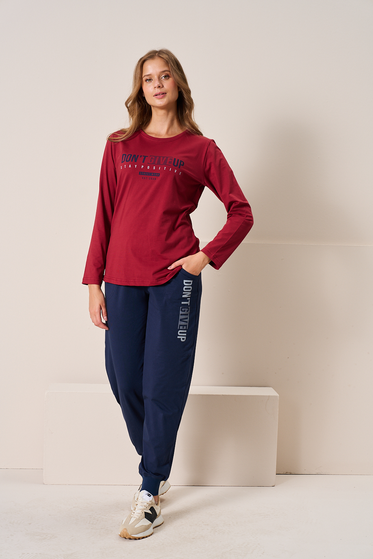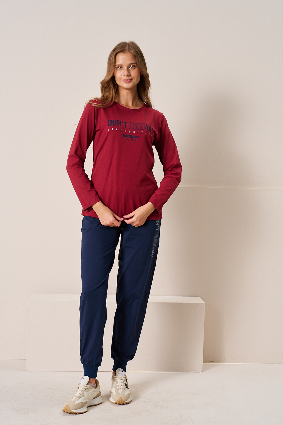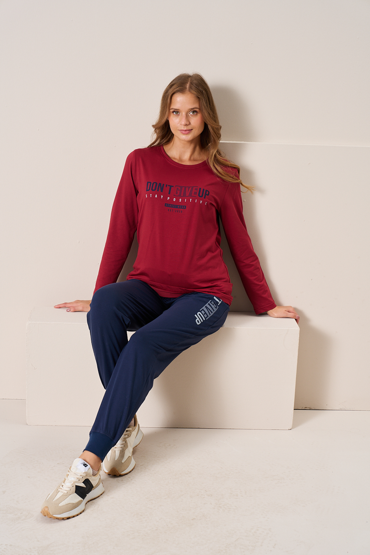 Rahatlığı ve şıklığı bir arada sunan Kadın Bordo Uzun Kollu Baskılı Pijama Takımı, ev giyiminde konforu ön planda tutan kadınlar için tasarlandı.