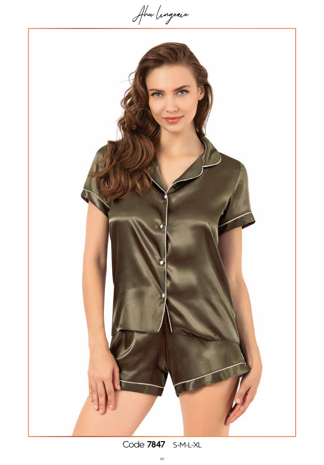 Kadın Saten Biyeli Kısa Kol Şortlu Pijama Takım | Haki 7847 (2090050185)