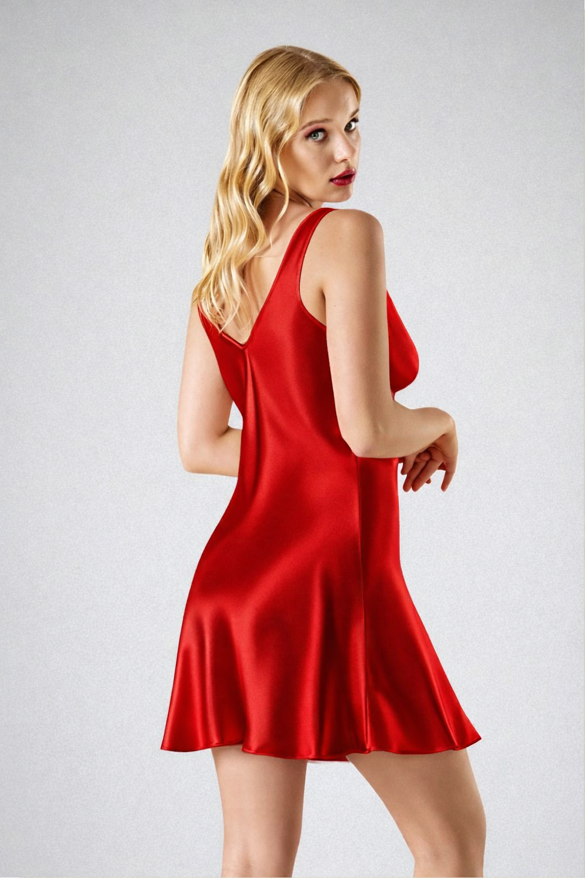 Parlak ve akışkan saten dokusu vücuda yumuşak bir şekilde oturarak pürüzsüz ve zarif bir siluet oluşturur.