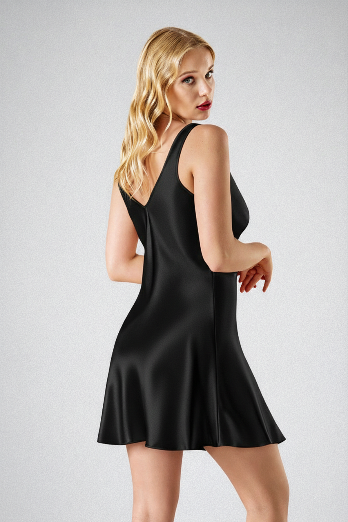 Parlak ve akışkan saten dokusu vücuda yumuşak bir şekilde oturarak pürüzsüz ve zarif bir siluet oluşturur.