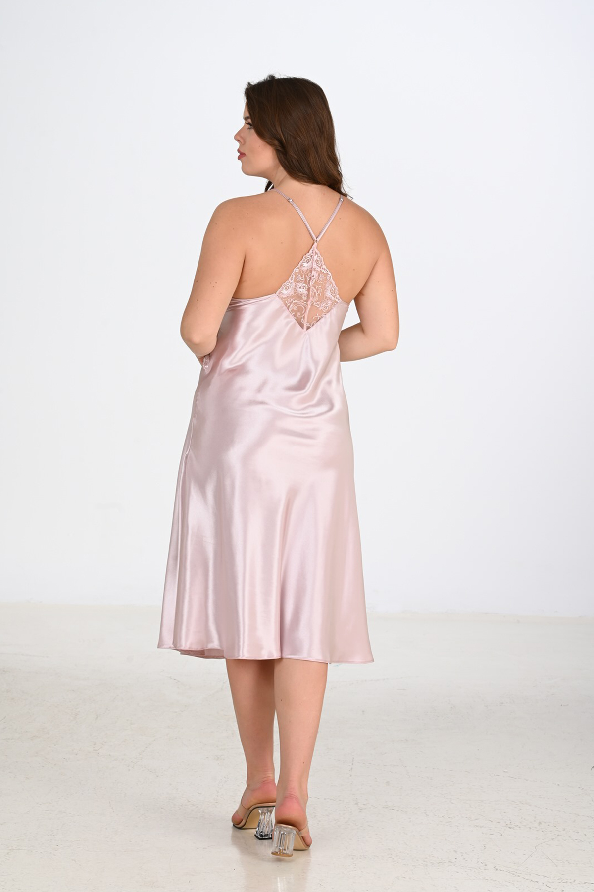 Kadın Saten Yırtmaçlı Sırt Detay Büyük Beden Gecelik | Pudra 2201 (2091240489)