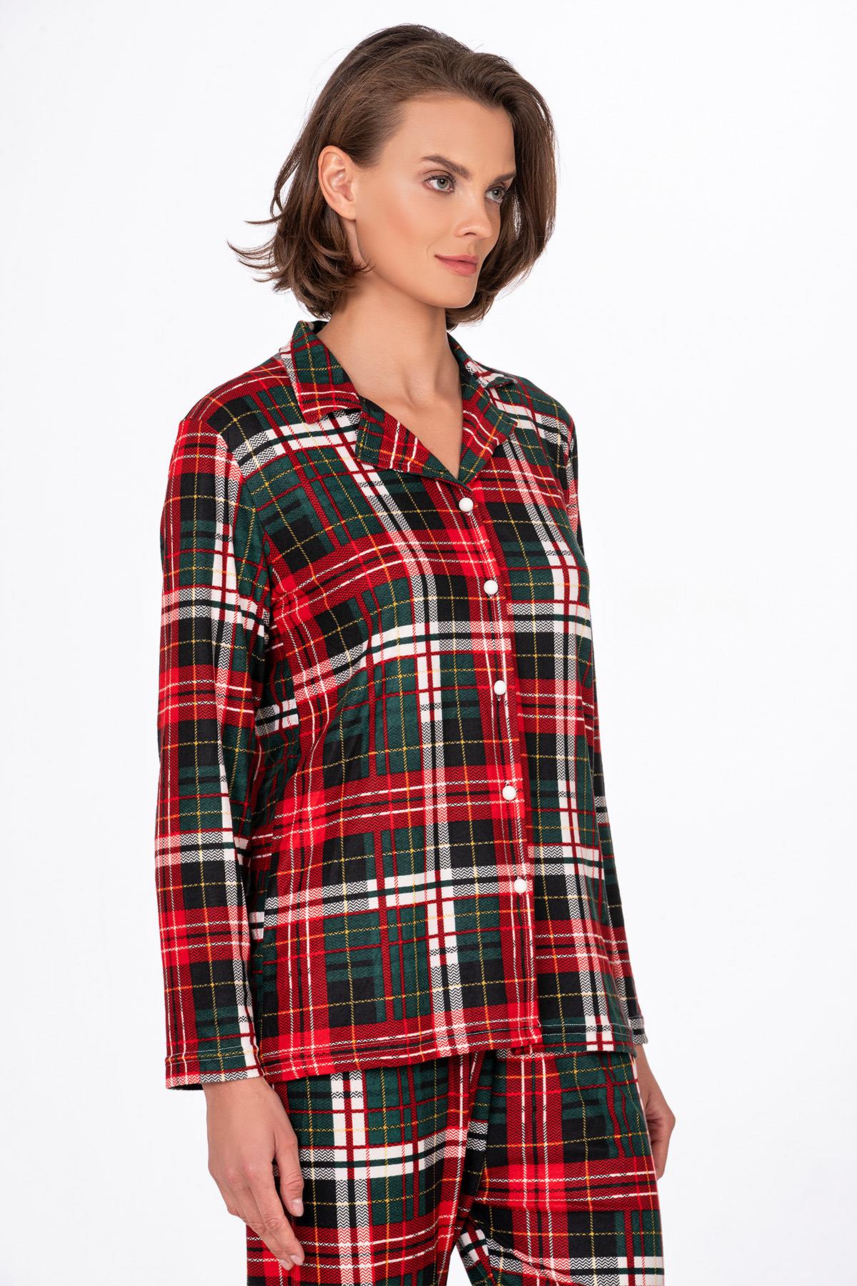 Kadın Süet Önden Düğmeli Pijama Takımı | Yeşil Ekose (2071060014)
