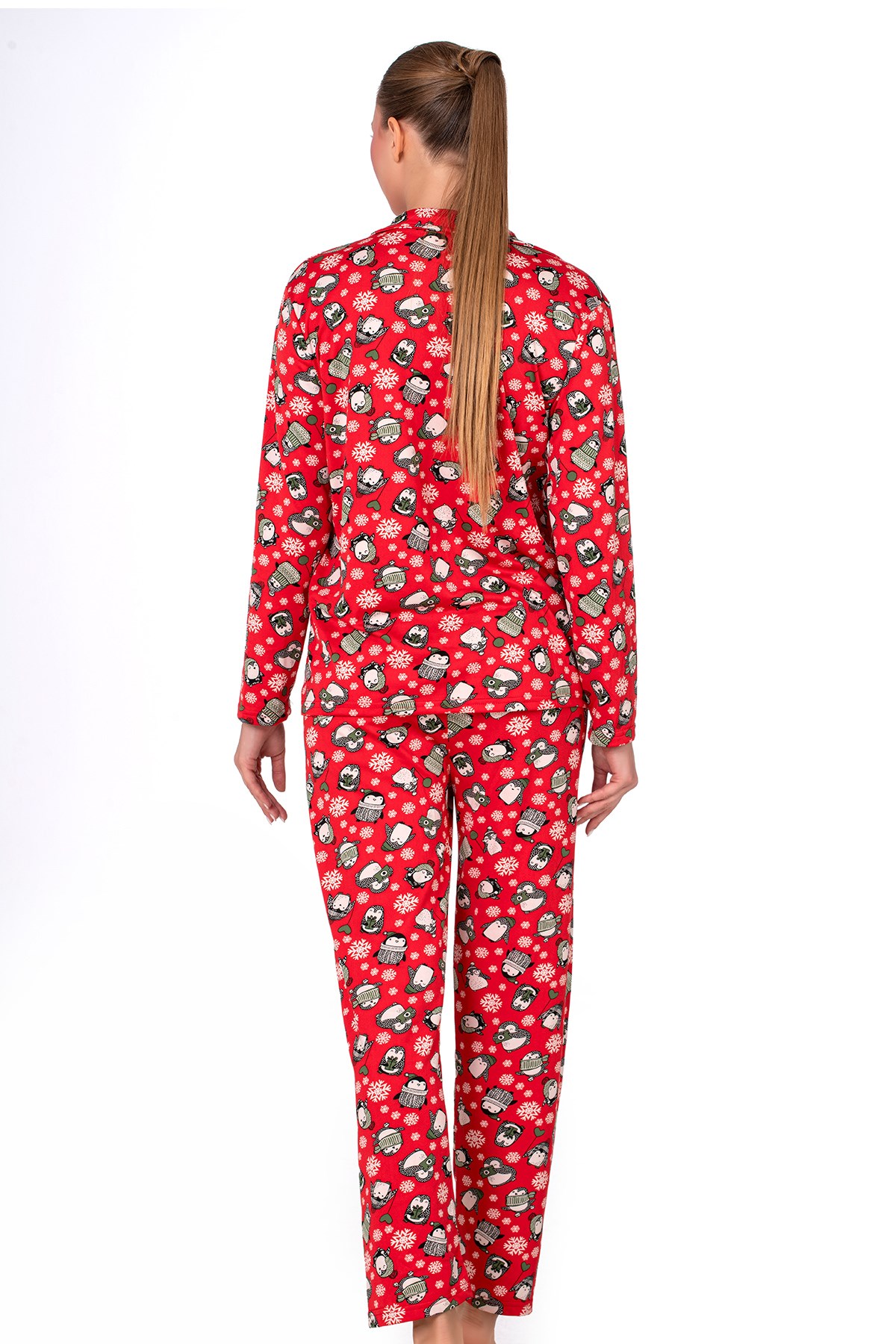 Canlı kırmızı zemini ve kış temalı desenleriyle dikkat çeken bu pijama takımı, yumuşak dokulu kumaşı sayesinde serin havalarda sıcak ve konforlu bir kullanım sunar.