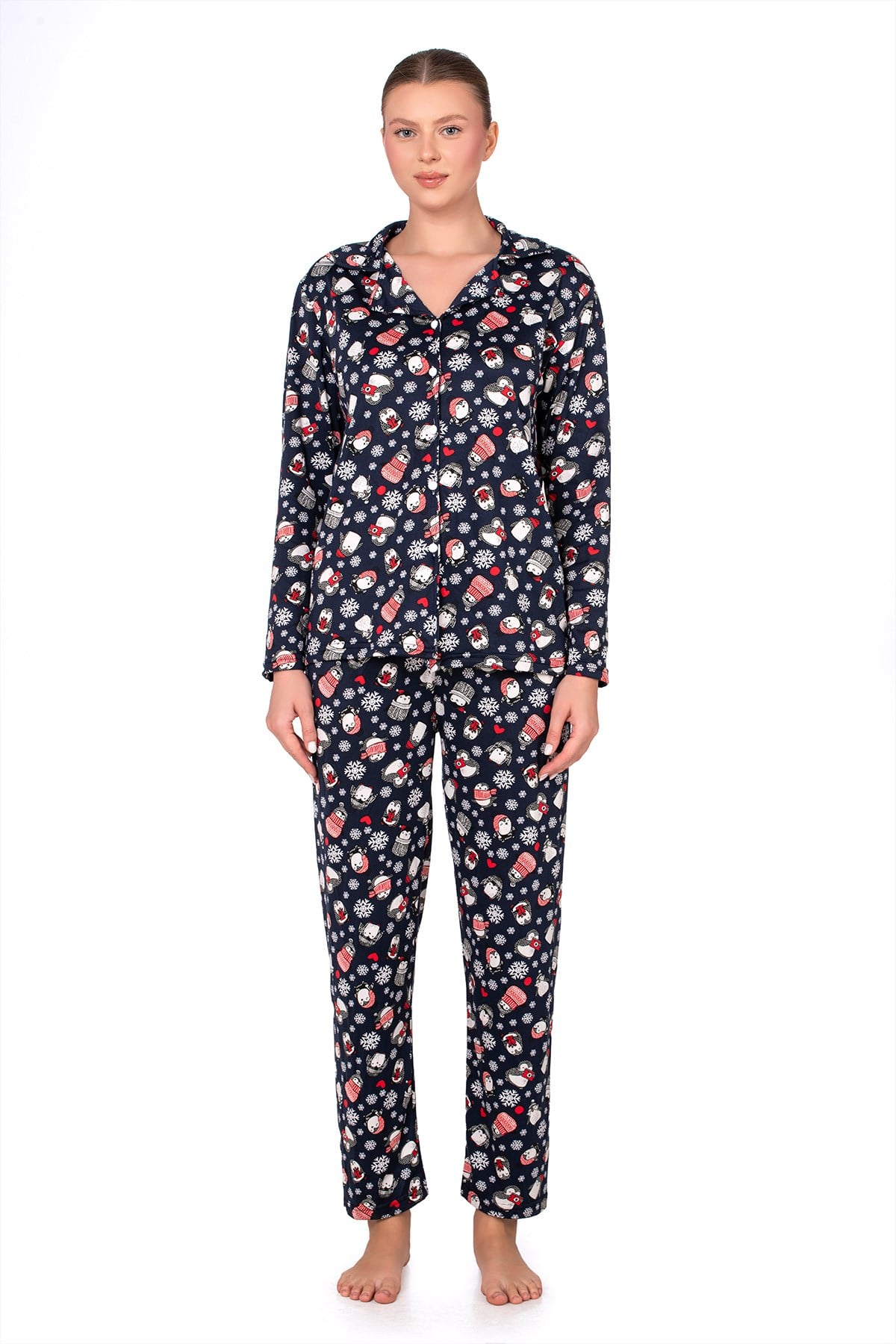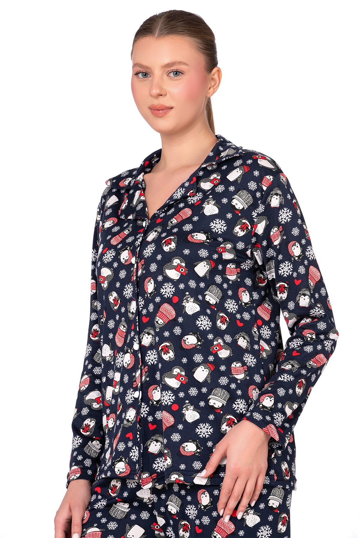 Lacivert zemin üzerine kış temalı desenleriyle öne çıkan bu pijama takımı, yumuşak dokulu kumaşı sayesinde serin havalarda sıcak ve konforlu bir kullanım sunar.