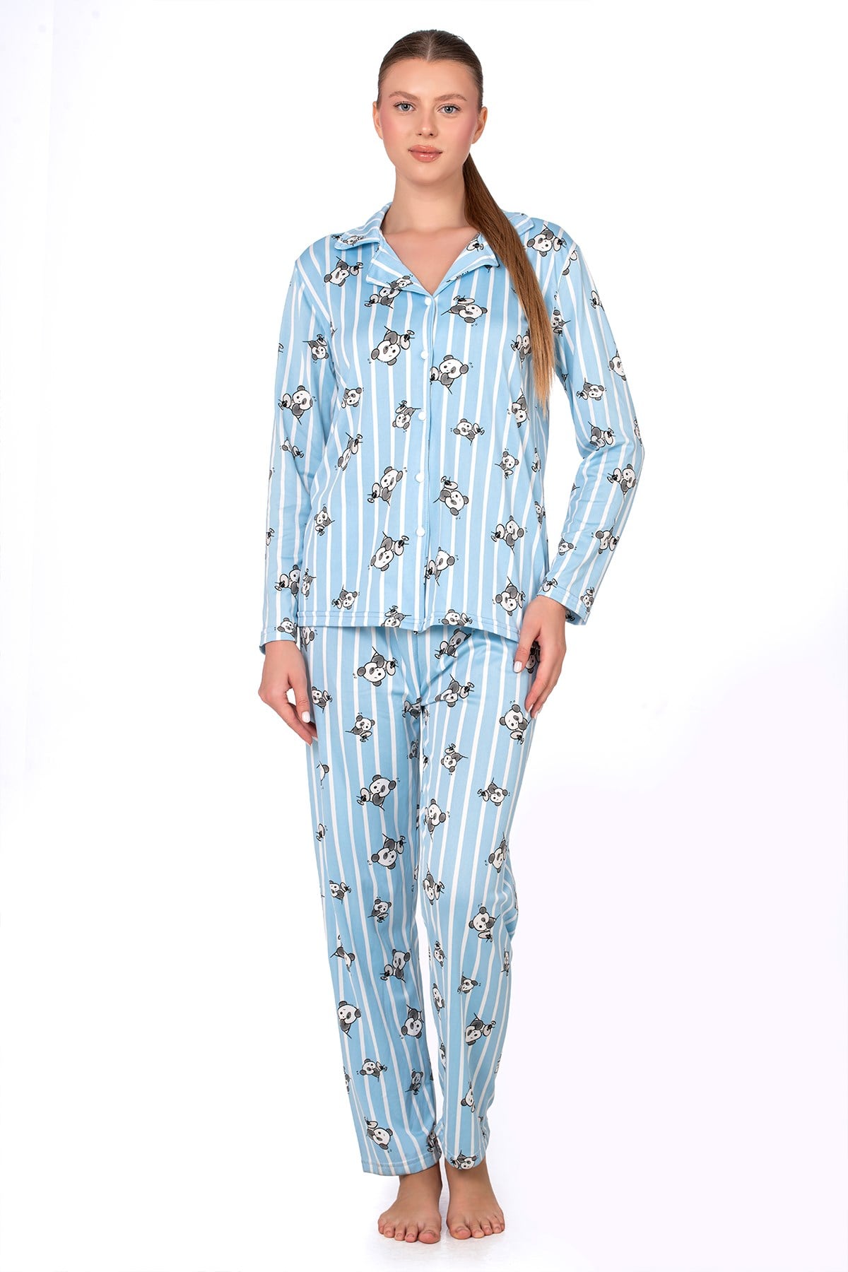 Sevimli panda deseni ve çizgili tasarımıyla öne çıkan bu pijama takımı, yumuşak dokulu kumaşı sayesinde gece boyu konfor ve sıcaklık sunar.