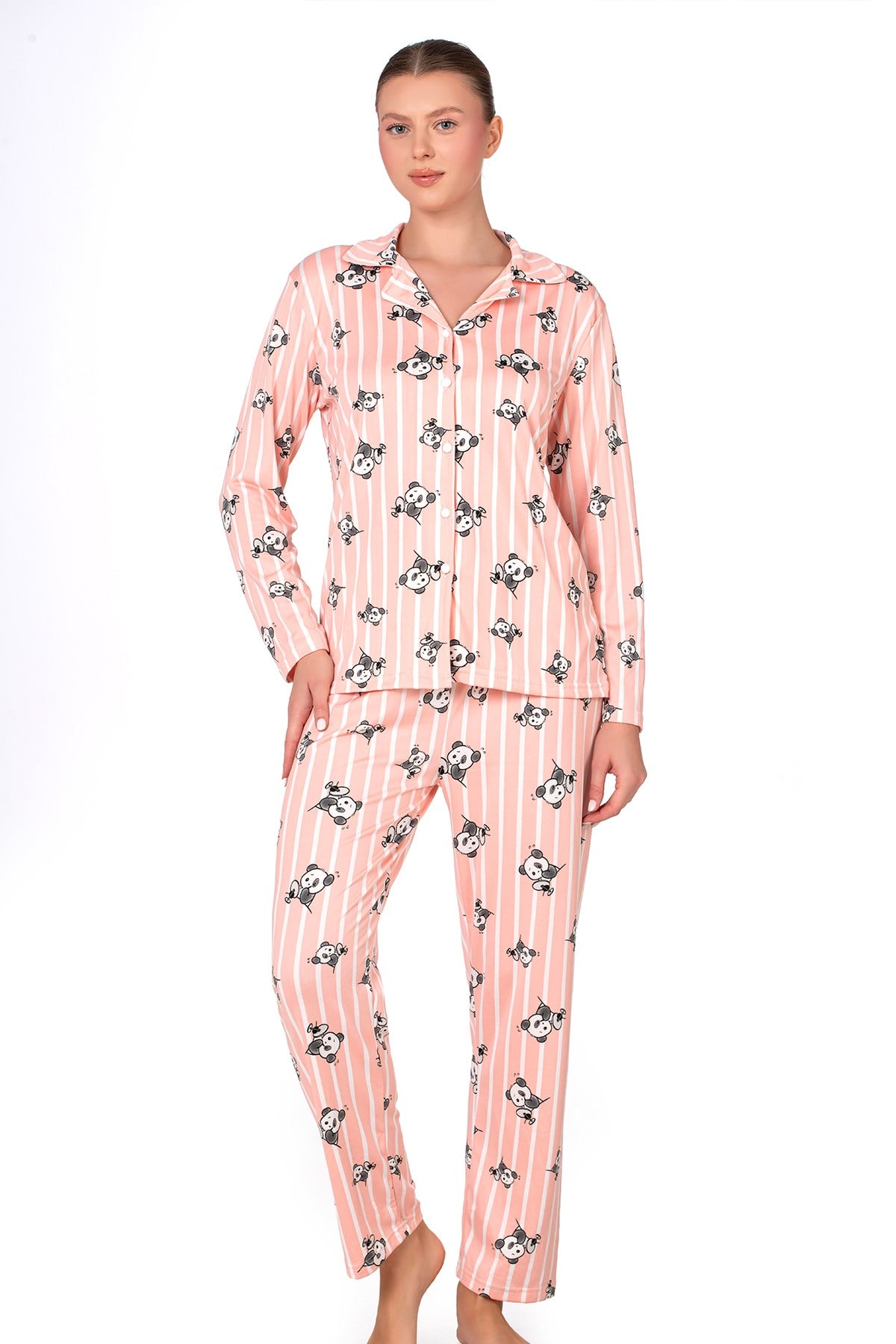 Somon rengi zemin üzerine panda ve çizgi deseniyle tasarlanan bu pijama takımı, yumuşak dokulu kumaşı sayesinde gece boyu konforlu bir uyku deneyimi sunar.