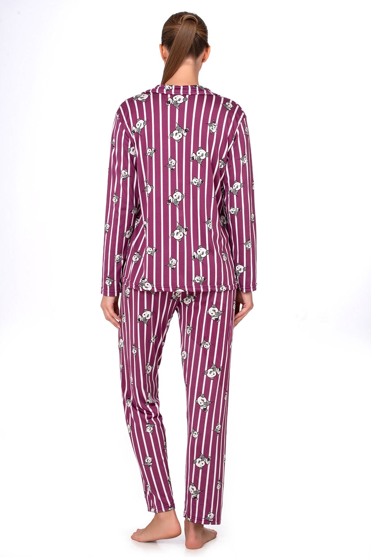 Mürdüm zemin üzerine çizgili ve panda desenli tasarımıyla öne çıkan bu pijama takımı, yumuşacık dokusuyla gün boyu ve gece boyunca rahatlık sunar.