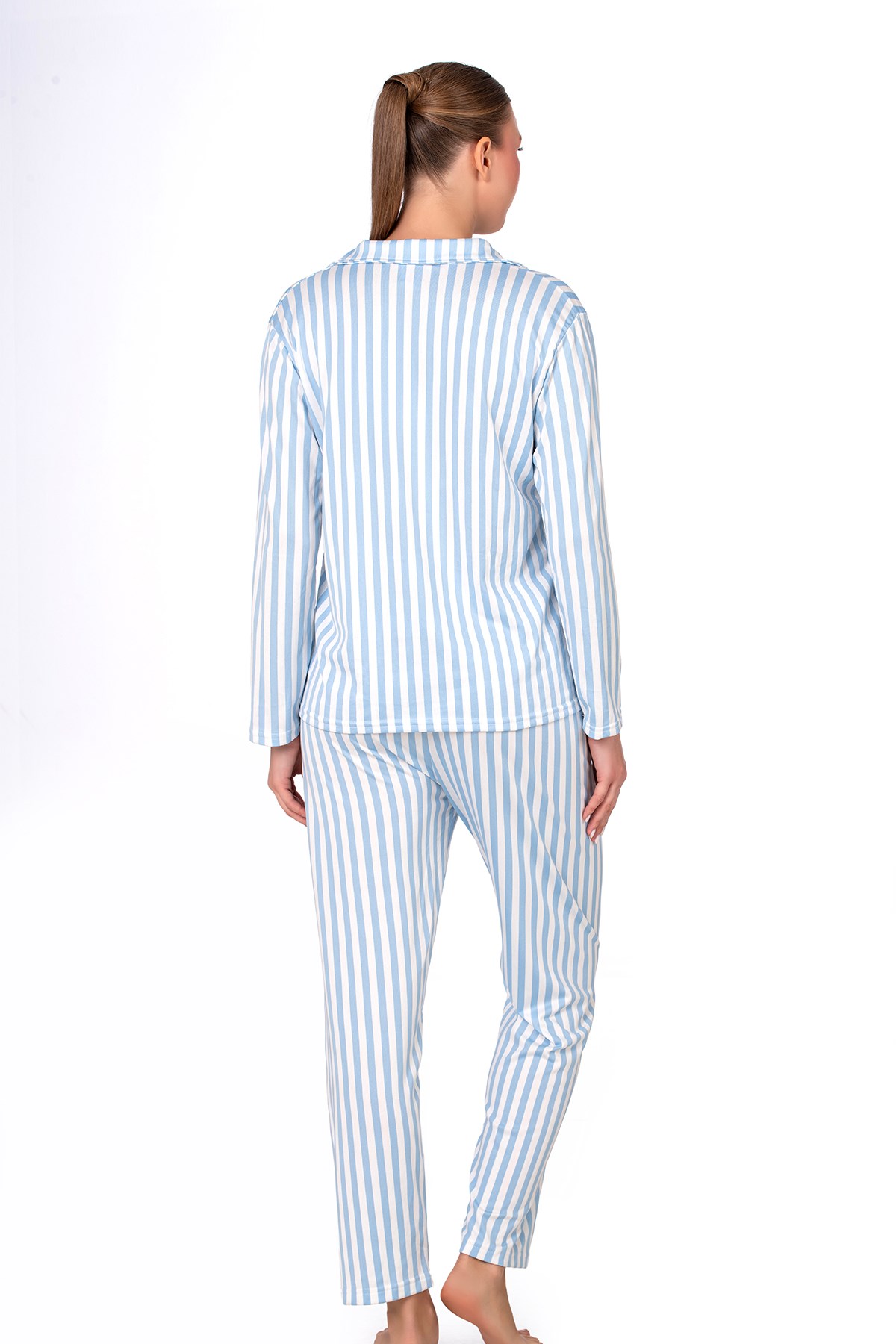 İçi şardonlu yumuşak Lizbon kumaştan üretilen bu mavi-beyaz çizgili pijama takımı, serin akşamlarda vücudu nazikçe sararak sıcak tutar.
