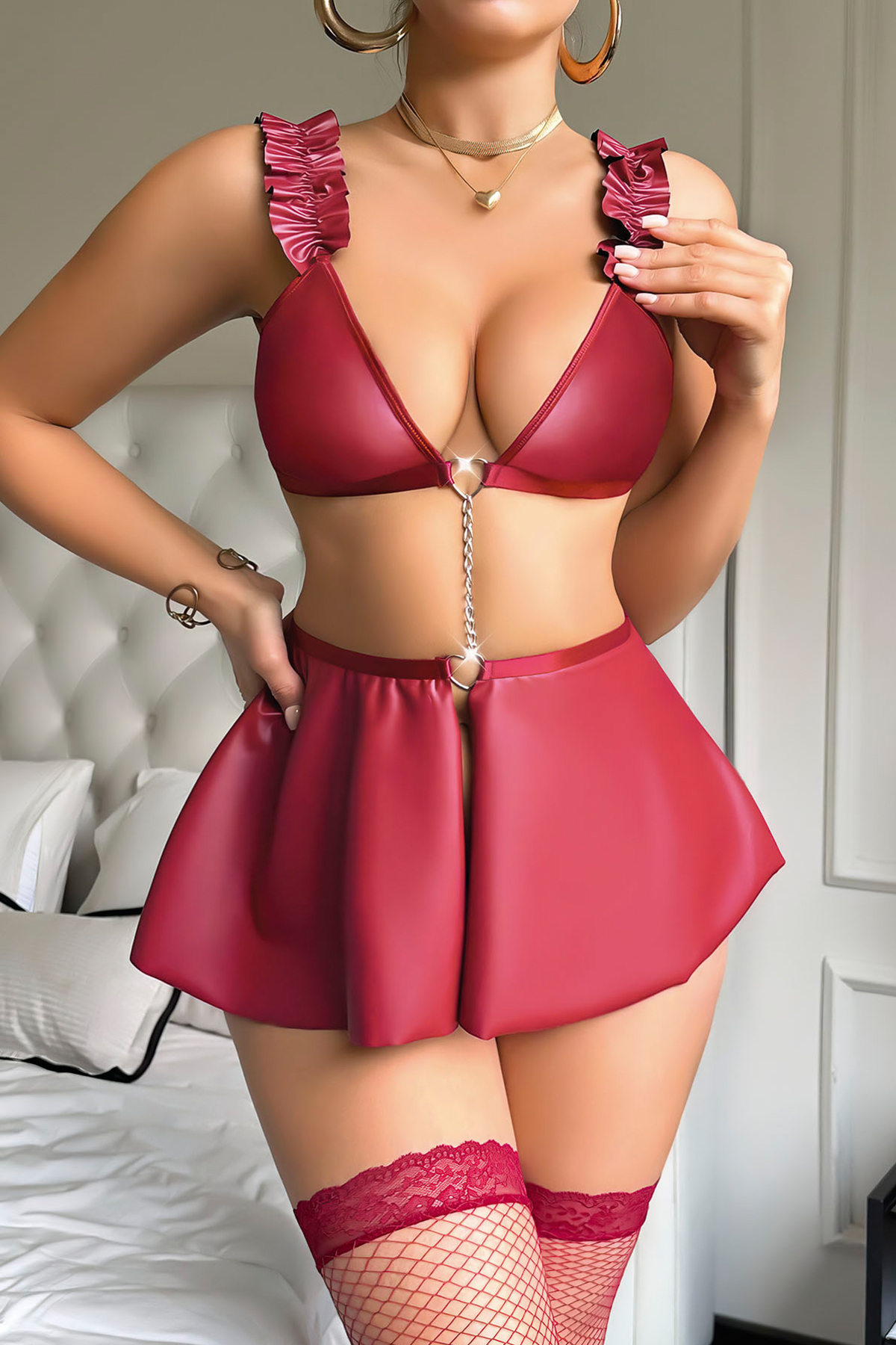 Cesur ve feminen tasarımıyla öne çıkan Zincirli Fırfır Detay Fantezi Etek Takım, iddialı stil arayanlar için özel olarak tasarlanmıştır.